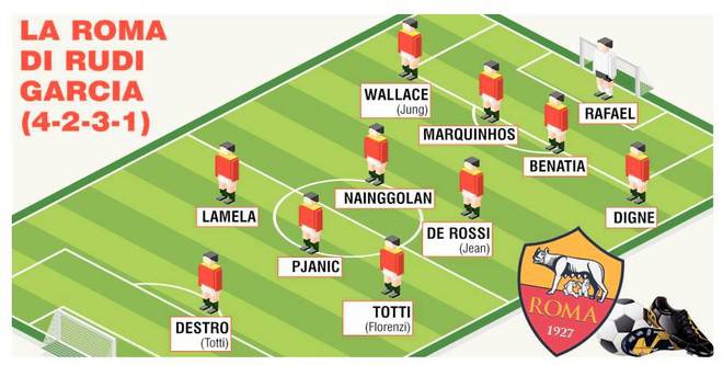FOTO CALCIOMERCATO ROMA GARCIA DESTRO – L’ultimo progetto Roma è andato in frantumi. Le basi per ripartire scordandosi delle ultime due pessime stagioni ci sono tutte e passano per il nuovo allenatore dei giallorossi: Rudi Garcia. Ovviamente servirà metter mano al portafoglio e intervenire sul mercato con acquisti mirati e utili alla causa. Per esempio, nel gioco pensato da Garcia, sarebbero utili Nainggolan, come schermo davanti la difesa assieme a De Rossi, e appunto qualche nome per puntellare il reparto arretrato, vero tallone d’Achille della Roma. Benatia per il centro della difesa e Wallace e Digne sulle corsie esterne. Come si vede poi dalla foto, presa dal Corriere dello Sport, Garcia attuerebbe un 4-2-3-1 con un’unica punta: Destro supportato da un trio ricco di classe ovvero Totti, Lamela e Pjanic.