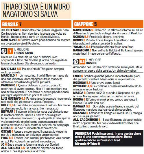 BRASILE GIAPPONE VOTI PAGELLE – Il Brasile ha inaugurato la Confederation Cup con una netta vittoria sul Giappone. I brasiliani hanno sconfitto il Giappone per 3-0 grazie ad un gol fantastico di Neymar e alle reti di Paulinho e Jo. Tra i verdeoro, il migliore in assoluto è stato l’ex milanista Thiago Silva, un vero muro, difficile da superare. Da manuale un paio di anticipo. Sta diventando un vero leader. Grande prova anche del neo acuisto del Barcellona, Neymar, che ha confermato le sue qualità così come Paulinho nel mirino di Roma e Inter.
