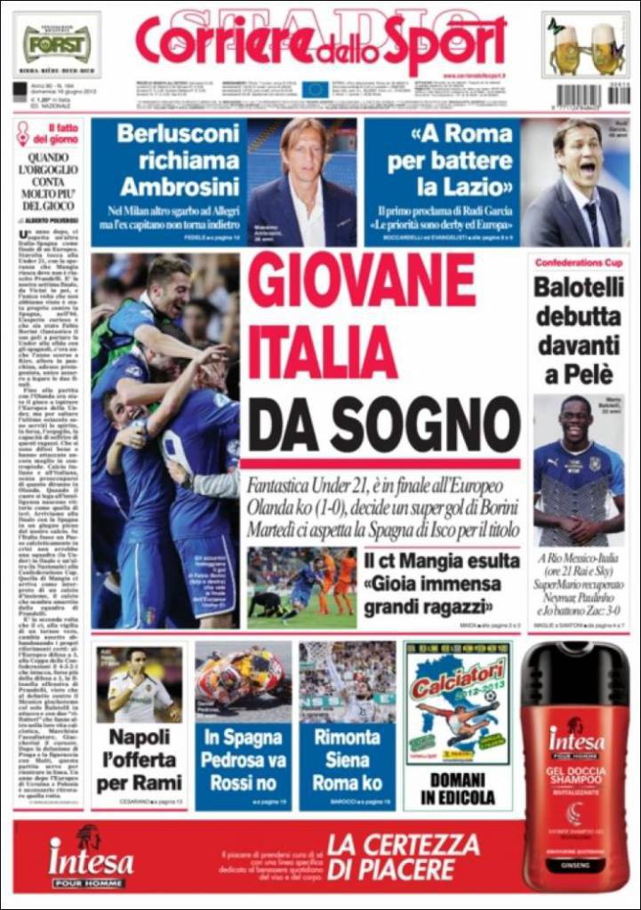 RASSEGNA STAMPA CORRIERE DELLO SPORT – Fantastica Under 21, è in finale all’Europeo. Olanda ko (1-0), decide un super gol di Borini. Martedì ci aspetta la Spagna di Isco per il titolo. Balotelli debutta davanti a Pelè. Berlusconi richiama Ambrosini: nel Milan altro sgarbo ad Allegri ma l’ex capitano non torna indietro. “A Roma per battere la Lazio“. Il primo proclama di Rudi Garcia: “Le priorità sono derby ed Europa”.