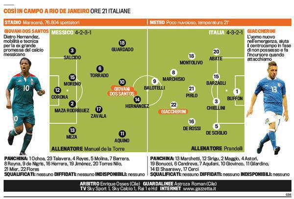 MESSICO ITALIA CONFEDERATION CUP – Inizia questa sera, alle 21, ora italiana, il cammino della Nazionale di Cesare Prandelli nella Confederation Cup. Gli Azzurri avranno di fronte il Messico, campione olimpico in carica. Prandelli schiererà la squadra con il 4-3-2-1 con Buffon tra i pali, Abate, Barzagli, Chiellini, De Sciglio in difesa; Montolivo, Pirlo, De Rossi a centrocampo; Marchisio e Giaccherini a sostegno dell’unica punta che sarà Balotelli, nonostante lo spavento di due giorni fa quando Super Mario ha abbandonato l’allenamento per un piccolo problema muscolare. Il Messico risponde con il 4-2-3-1 con Corona tra i pali; Salcido, Moreno, Maza Rodriguez e Meza in difesa; Zavale, Torrado davanti la difesa; Aquino, Giovani Dos Santos e Guardado a sostegno dell’unica punta che sarà Hernandez.