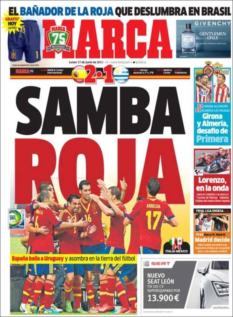RASSEGNA STAMPA MARCA – Debutto positivo per la Spagna alla Confederation Cup che contro l’Uruguay s’impone per gioco e risultato finale. Le Furie Rosse battono Cavani e company per 2-1 grazie ai gol di Pedro e Soldado. Il gol dell’Uruguay porta la firma di Suarez.