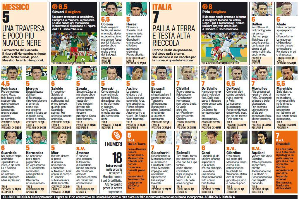 MESSICO ITALIA VOTI PAGELLE GAZZETTA SPORT – Poco più in basso troverete i voti e le pagelle Gazzetta dello Sport di Messico-Italia, primo turno della Confederations Cup giocatosi ieri sera a Rio de Janeiro, e conclusosi con il risultato di due a 2 in favore dei nostri azzurri. Migliore in campo in assoluto è il solito Andrea Pirlo, autore di una vera e propria perla su punizione, e protagonista di una gara sublime. Grande prova anche per Balotelli, il vero Hulk della Confederations, autore di un gol rabbioso e di forza che ha regalato i tre punti ai nostri.