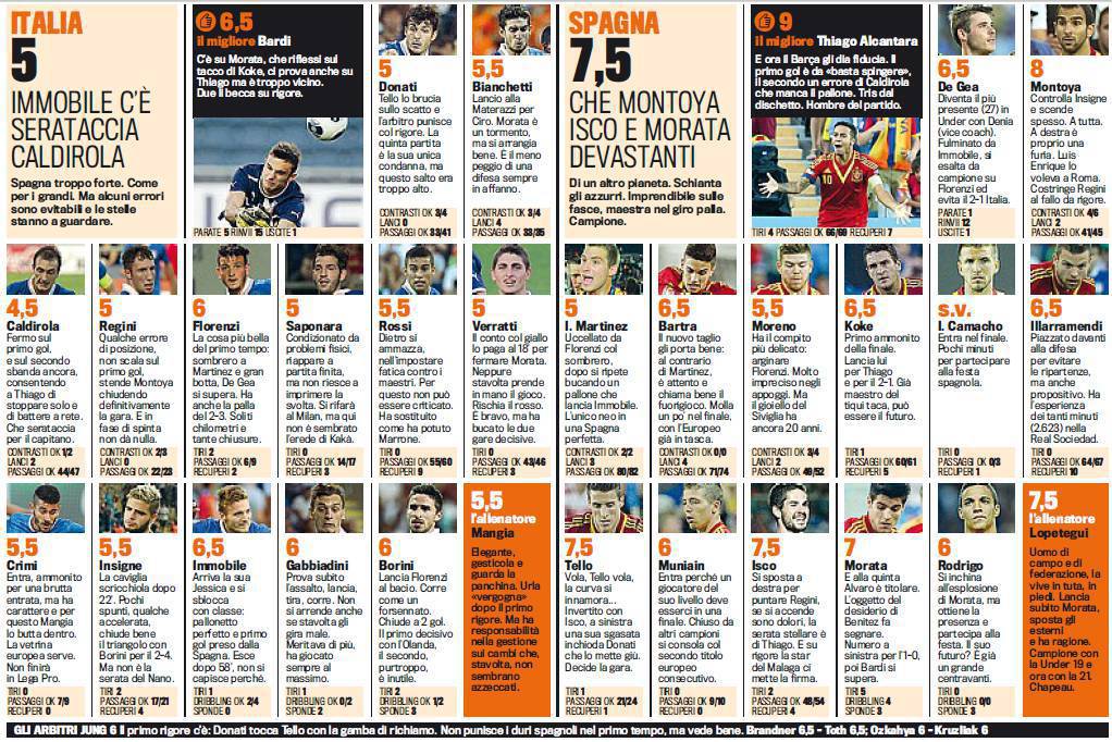 ITALIA SPAGNA VOTI PAGELLE THIAGO MONTOYA IMMOBILE – Troppa Spagna per l’Italia di Devis Mangia che esce con gli onori delle armi. Gli azzurri perdono quattro a due, il migliore in campo è sempre Bardi, portiere dell’Inter che quest’anno è stato in prestito al Novara. Malissimo Caldirola, altro giocatore dell’Inter, autore di due svarioni decisivi. Delude anche Verratti ingabbiato dal centrocampo della Spagna. Meravigliosa prova di Thiago Alcantara che prende 9 in pagella, tripletta e giocate sontuose. Un calciatore unico. Ecco i voti e le pagelle della Gazzetta dello Sport.