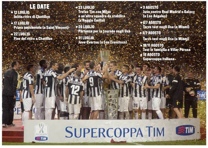 Juventus News Precampionato Date- Amate la Juventus e la volete seguire per tutta l’estate? Ecco tutti gli appuntameti dei bianconeri in vista della stagione 2013-2014. Dal ritiro a Chatillon alla turneè in Usa passando per il trofeo Tim (con il Milan e un’altra squadra da decidere) e a Supercoppa Italia che si dovrà disputare con la Lazio (detentrice della Coppa Italia). Da decidere solo il luogo della finale con i biancocelesti dato che le due società stanno discutendo e non riescono a trovare un accordo.