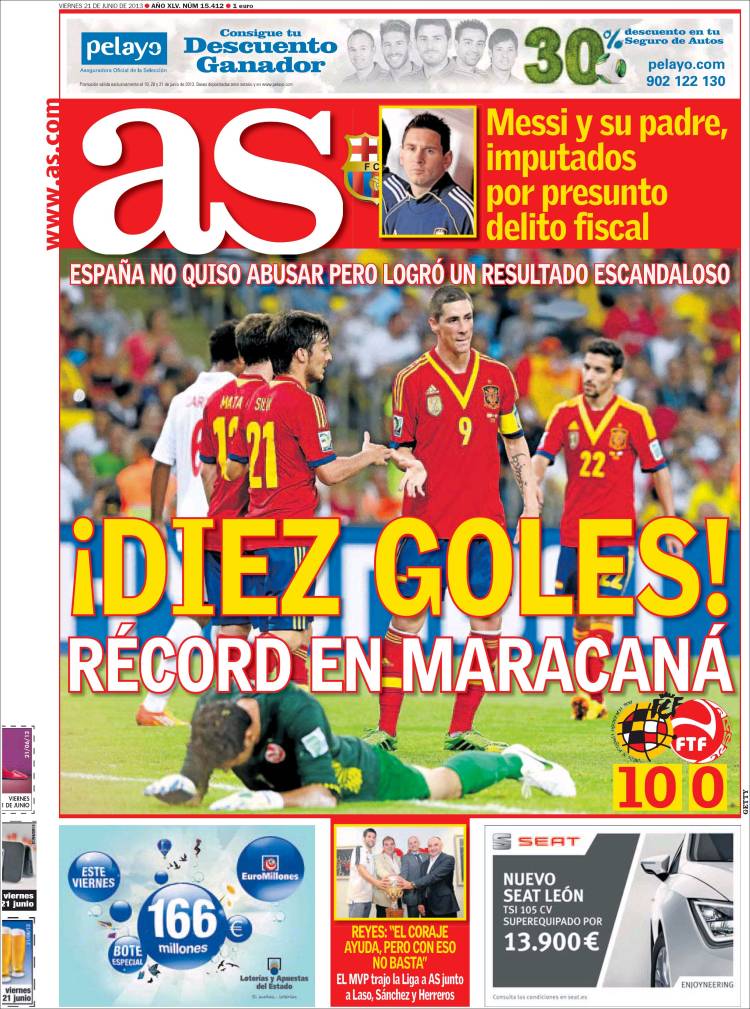 AS SPAGNA – La Spagna vince dieci a zero contro Tahiti facendo un nuovo record allo stadio Maracanà.
