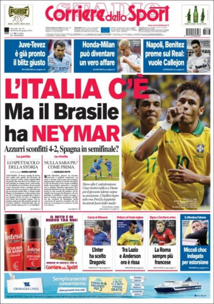 RASSEGNA STAMPA CORRIERE DELLO SPORT – Azzurri sconfitti 4-2: Spagna in semifinale? Juve-Tevez: è già pronto il blitz giusto. Honda-Milan può diventare un vero affare. Napoli, Benitez preme sul Real: vuole Callejon.