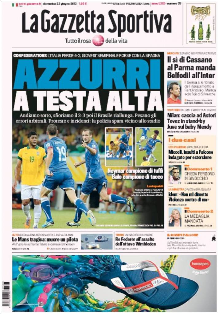 RASSEGNA STAMPA GAZZETTA DELLO SPORT – Azzurri sconfitti 4-2: giovedì la semifinale, forse con la Spagna. Andiamo sotto, sfioriamo il 3-3, poi il Brasile riallunga. Pesano gli errori arbitrali. Proteste e incidenti: la polizia spara vicino allo stadio. Il sì di Cassano al Parma manda Belfodil all’Inter. Milan, caccia ad Astori. Tevez in stand-by. Juve sul baby Mendy.