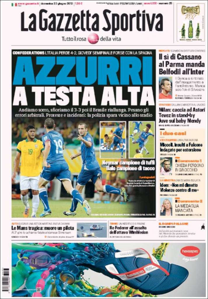 RASSEGNA STAMPA GAZZETTA DELLO SPORT – Azzurri sconfitti 4-2: giovedì la semifinale, forse con la Spagna. Andiamo sotto, sfioriamo il 3-3, poi il Brasile riallunga. Pesano gli errori arbitrali. Proteste e incidenti: la polizia spara vicino allo stadio. Il sì di Cassano al Parma manda Belfodil all’Inter. Milan, caccia ad Astori. Tevez in stand-by. Juve sul baby Mendy.