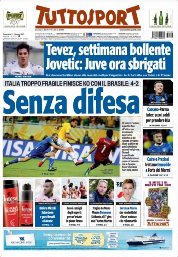 RASSEGNA STAMPA TUTTOSPORT – Italia troppo fragile e finisce ko con il Brasile: 2-4. Tevez, settimana bollente. Jovetic: Juve, ora sbrigati. Cassano-Parma-Inter: ecco i soldi per prendere Isla. Cairo e Preziosi trattano Immobile a Forte dei Marmi.