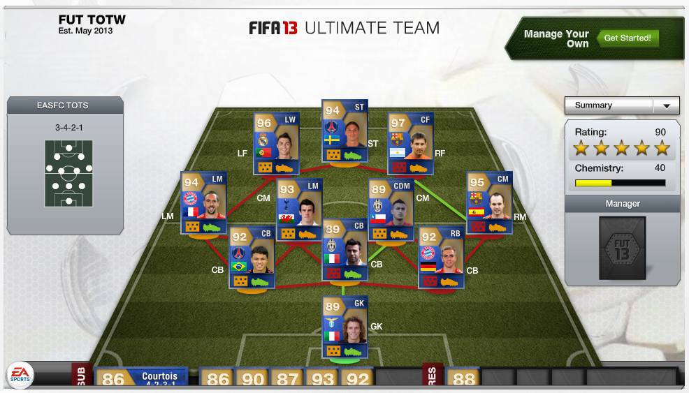 Mercato News Fifa Videogiochi- Come sapete il famosissimo gioco “Fifa” aggiorna di settimana in settimana i valori dei giocatori in base alle prestazioni degli stessi. A fine anno si può così stilare una lista dei migliori giocatori in assoluto di tutti i campionati. Il modulo scelto è il 3-4-3, ed è iper-offensivo. Gli unici due italiani in campo fanno parte della linea difensiva (in porta Marchetti, in difesa Barzagli), che viene completata da Lahm e Thiago Silva. A centrocampo Vidal è l’unico altro giocatore che milita nel campionato italian0, e viene affiancato da Iniesta, Bale e Ribery. E’ però l’attacco il vero pezzo forte della squadra: Messi, Ibrahimovic e Ronaldo fanno paura a tutti presi singolarmente, figuriamoci insieme…