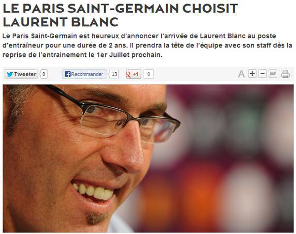 CALCIOMERCATO PSG – Con l’addio ufficiale di Ancelotti (trasferitosi al Real Madrid), il PSG ha ufficializzato lo sbarco di Laurent Blanc. Per l’ex ct della Francia un contratto da due anni.