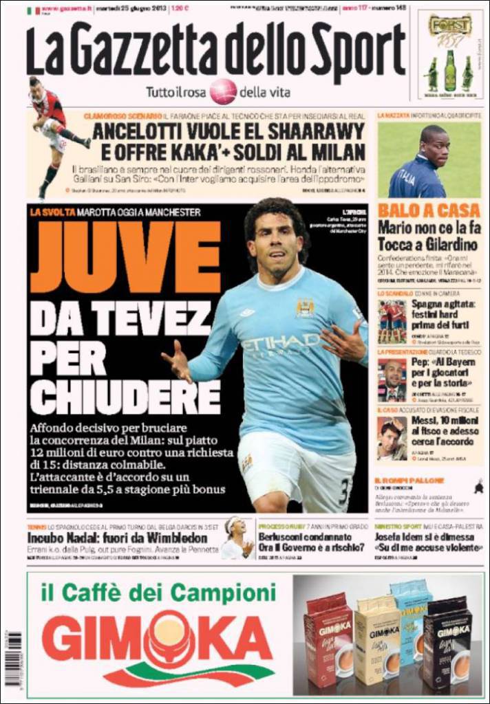 GAZZETTA DELLO SPORT JUVENTUS TEVEZ – Si prepara all’affondo decisivo per Carlitos Tevez la Juventus. Lo documenta la Gazzetta dello Sport, in edicola oggi.