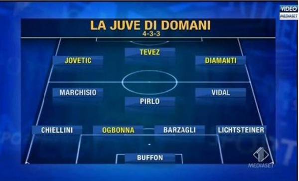 CALCIOMERCATO JUVENTUS – Ed ora la Juventus può davvero sognare in grande. Con l’arrivo ormai ufficiale di Tevez, e lo sbarco a breve di Ogbonna, la Vecchia Signora che sta nascendo appare davvero sensazionale. Se come sembra, i bianconeri chiuderanno anche i colpi Diamanti e Jovetic ecco che l’11 2013-2014 sarebbe praticamente da urlo. La redazione di Sportmediaset lo ha immaginato così, come si vede nella foto allegata, un 4-3-3 decisamente offensivo con il talentino Pogba addirittura in panchina. Vi convince questo 11?