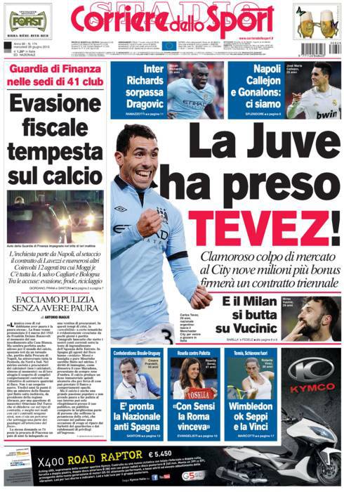 CORRIERE TEVEZ – Sul Corriere dello Sport si parla ovviamente del grande colpo della Juventus che ha preso Tevez.