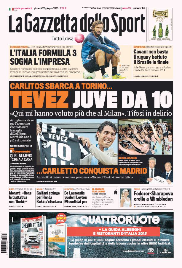 GAZZETTA TEVEZ – Tifosi in delirio per Tevez che mostra la maglia numero 10.