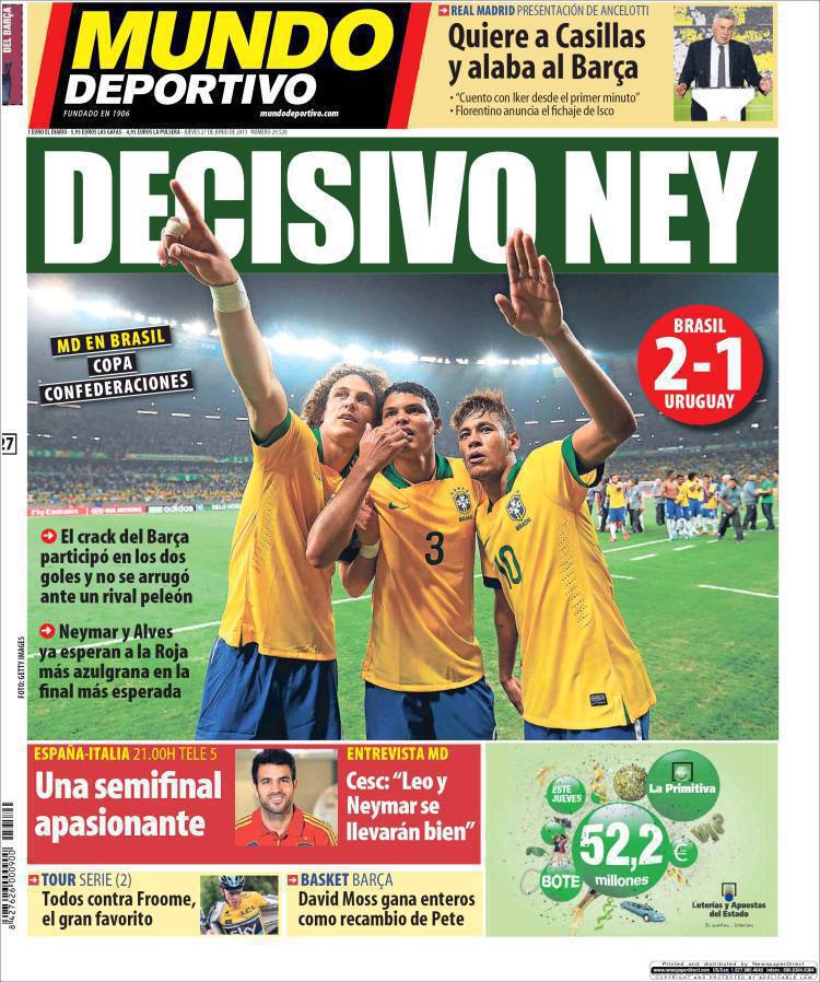 MUNDO DEPORTIVO NEYMAR – Sul quotidiano Mundo Deportivo si parla di Neymar ieri decisivo nel due a uno del Brasile contro l’Uruguay.