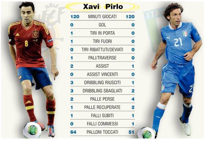 FOTO XAVI PIRLO SPAGNA ITALIA – La recente sfida tra Spagna e Italia della Confederations Cup brasiliana ha visto scendere in campo moltissime stelle del calcio mondiale. Nel dettaglio, in questo articolo, vogliamo analizzare ai raggi X la gara disputata dai due architetti delle rispettive squadre. Da una parte Xavi, centrocampista del Barcellona nonchè metronomo della Roja, dall’altra Pirlo, ex milanista letteralmente rinato da quando la Juventus ha deciso di puntare su di lui. Osservando i dati della foto, notiamo come entrambi non siano stati al top della loro forma. Fra i due, considerando anche l’infortunio recente, Pirlo è parso quello più in palla. Al contrario Xavi ha disputato una partita buona ma nettamente al di sotto delle sue capacità.