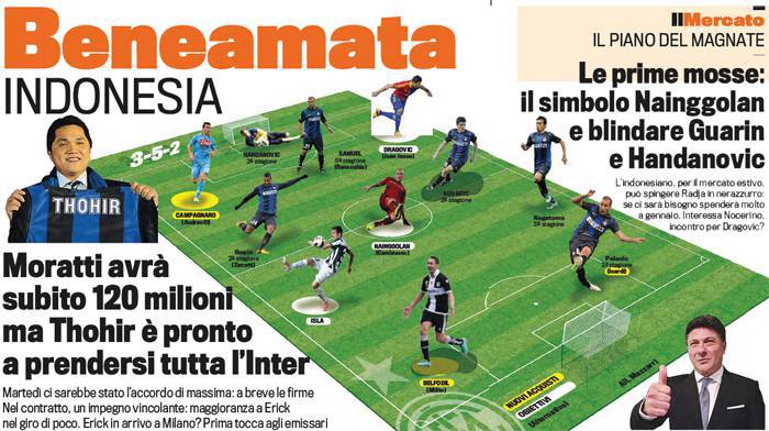 CALCIOMERCATO INTER THOHIR 11 NERAZZURRO – E’ fatta, l’Inter di Massimo Moratti si tingerà di indonesiano tra qualche giorno. E’ stato trovato l’accordo tra il presidente nerazzurro e il magnate indonesiano Thohir, che prenderà il 40% delle azioni nerazzurre per passare nel giro di pochi anni a proprietario della società milanese. Thohir ha voluto fortemente entrare nella società nerazzurra ed è pronto a sborsare subito 120 milioni di euro che aiuteranno le casse del club e soprattutto aiuterà la squadra a rinforzarsi in sede di mercato. E già si parla della nuova Inter per la prossima stagione. Soprattutto si cercherà di blindare i gioielli. In porta quindi dovrebbe esserci ancora Samir Handanovic, portiere sloveno che piace molto al Barcellona. Non andrà via neanche per un’offerta stratosferica, viene considerato uno dei più forti nel suo ruolo. In difesa potrebbe arrivare qualche altro giocatore, Mazzarri considera titolari Samuel e Campagnaro, mentre Juan Jesus dovrà migliorare. Ranocchia non è incedibile, non a caso Mazzarri vorrebbe puntare su Dragovic, classe ’91, talento del Basilea. I nerazzurri però non vorrebbero spendere gli 8 milioni di euro richiesti dal club svizzero. A centrocampo ci sono diversi calciatori che piacciono all’Inter. A sinistra potrebbe esserci l’affondo per Kolarov ma Mazzarri potrebbe anche decidere di puntare su Nagatomo e Alvaro Pereira. Due giocatori, soprattutto il secondo, che potrebbero fare bene con l’allenatore toscano. A centrocampo il giocatore prescelto da Mazzarri è Nainggolan, centrocampista belga del Cagliari classe ’88 che piace anche alla Roma. A destra si cercherà di concludere l’acquisto di Mauricio Isla, tornante cileno classe ’88 che è a metà tra Juventus e Udinese solo che a Torino non ha convinto e vorrebbe giocare a Milano. Il costo della metà della Juventus è di 7,5 milioni di euro, l’Inter per ora offre 5,5 milioni di euro. Potrebbe esserci la svolta decisiva. Guarin dovrebbe rimanere perché piace tantissimo a Mazzarri. In attacco ci sarà Rodrigo Palacio e Belfodil, arrivato direttamente dal Parma. Una nuova Inter targata Thohir, i tifosi nerazzurri sperano sia vincente.