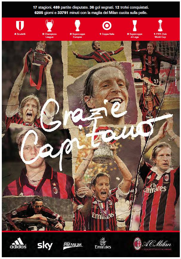 MILAN ADDIO AMBROSINI – Con un’intera pagina sulla Gazzetta dello Sport, il Milan ha voluto salutare nel migliore dei modi il suo capitano, Massimo Ambrosini al quale non è stato rinnovato il contratto dopo 17 anni di militanza in rossonero: “17 stagioni, 489 partite, 36 gol segnati, 12 trofei conquistati. 6205 giorni e 33791 minuti con la maglia del Milan cucita sulla pelle”, scrive il Milan chiudendo con un “Grazie Capitano” su una serie di foto che ritraggono il centrocampista con i suoi momenti migliori al Milan.