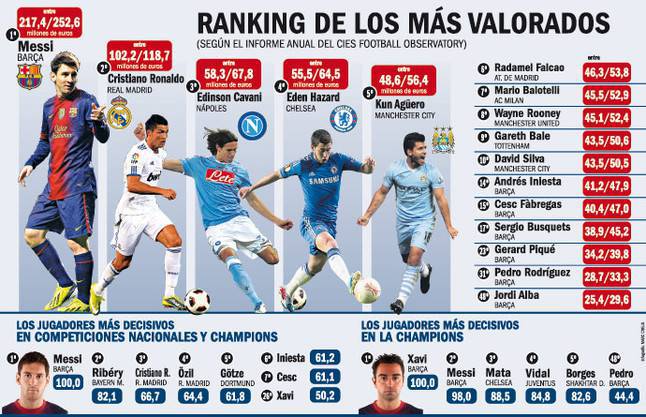 FOTO GRAFICA CALCIATORI COSTO MESSI CR7 – Sfruttando i dati forniti dal Cies Football Observatory, la redazione di Sport, noto quotidiano sportivo catalano, ha realizzato un’intelligente grafica che mette in fila i calciatori di maggior valore economico sul mercato. A dominare è ovviamente l’argentino del Barça Leo Messi, seguito da Cristiano Ronaldo, riaprendo un dualismo mai sopito tra i due. Sorprendentemente, ma forse non troppo, al terzo posto c’è il bomber del Napoli, Edinson Cavani. Subito dietro di lui il belga del Chelsea, Eden Hazard, completa la top 5 Sergio “El Kun” Aguero.