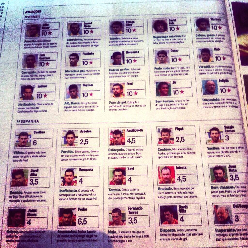 FOTO BRASILE SPAGNA CONFEDERATIONS CUP – Di solito è la stampa italiana quella che, per esaltare o sminuire la prova dei giocatori in una partita, si affida alle pagelle. Sui nostri quotidiani sportivi compare sempre uno spazio accanto al commento del match in cui il giornalista assegna il suo voto alla prestazione offerta da ogni singolo uomo sceso in campo. Numeri che mediamente non si allontano dallo standard: dal 5 al 7. Molto rari i casi in cui si esagera o si inveisce. Ebbene, questa volta, la stampa brasiliana ha stupito tutti! Guardare la foto per credere. La gara a cui si riferisce il giornale Carioca è la recente finale di Confederations Cup: i giocatori del Brasile sono tutti da 10 mentre quelli della Spagna…gravemente insufficienti. Per la Roja bocciature gravissime. Si va dai 2,5 di Piquè e Arbeloa al 3 di Sergio Ramos e l’allenatore Del Bosque. Iniesta e Xavi? Rispettivamente 4,5 e 4. Quando si parla di eccessi…