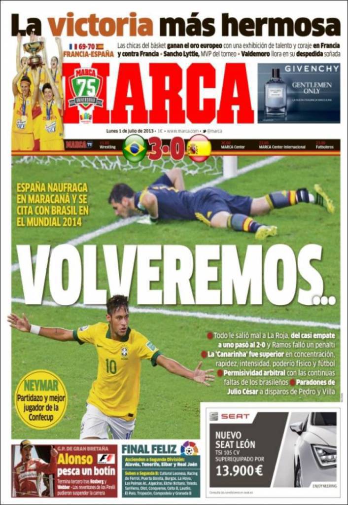 MARCA SPAGNA – La Spagna umiliata tre a zero dal Brasile nella finale di Confederations Cup.