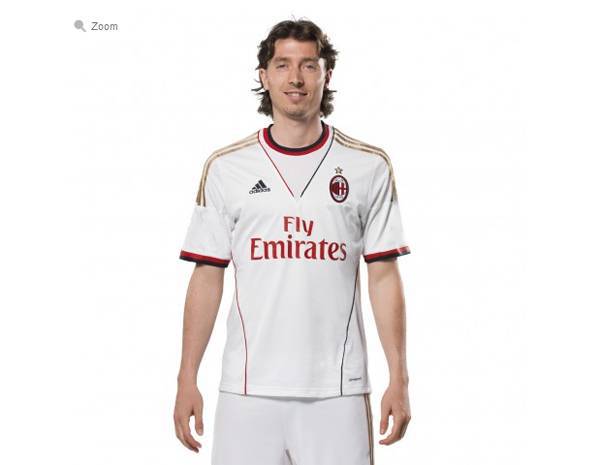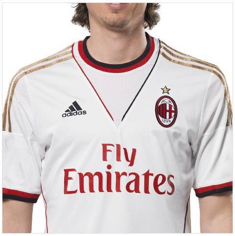 UFFICIALE MAGLIA MILAN 2013 2014 – E’ stata ufficialmente svelata la nuova maglia Milan away 2013-2014. Confermate, come da copione, le indiscrezioni circolanti sul web durante le scorse settimane. La divisa da trasferta utilizzerà il classico colore bianco, con inserti in oro, uno dei colori rilevanti della nuova linea Milan 2013-2014. Presente un “finto” collo a V in rosso e nero, molto simile a quello della Spagna per la casacca utilizzata durante la Confederations Cup (firmata proprio Adidas). Le tre strisce adidas sulle spalle sono color oro e a completare il tutto il classico logo della casa sportiva e il simbolo del Milan.