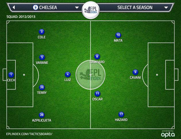 FOTO CHELSEA 2013-2014 MOURINHO 4-3-3 – Ritornare a dominare in Inghilterra ed in Europa è il primario obiettivo del nuovo corso del Chelsea. In testa, ancora una volta, Josè Mourinho, tecnico ex Inter e Real Madrid, desideroso di tornare a far bene nella nazione dove meglio, a suo dire, si interpreta il calcio. Di concerto con il patron Roman Abramovich, verranno portati a Londra 2 giocatori, essenziali per realizzare uno spettacolare 4-3-3 che potete ammirare nella grafica. Edinson Cavani e Rafael Varane, sembrerebbero infatti essere i calciatori richiesti sul mercato dallo Special One, per tornare a vincere. Ci riuscirà?