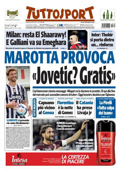 TUTTOSPORT MAROTTA – Anche Tuttosport riporta la provocazione di Marotta riguardo al tema Jovetic.