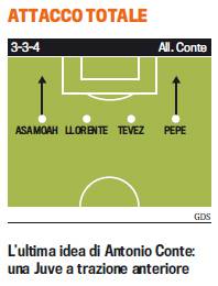 FOTO JUVENTUS CONTE ATTACCO 3-3-4 – L’arrivo di Tevez e Llorente in casa Juventus, non fa che aumentare nettamente la caratura dell’attacco della Juventus, squadra che senza dubbio punta al trionfo italiano ed europeo. Antonio Conte, tecnico della Juventus, starebbe studiando la possibilità di utilizzare uno spregiudicatissimo 3-3-4, modulo che, oltre alla presenza dei due nuovi acquisti, prevede l’utilizzo sulle fasce di Kwadwo Asamoah e del redivivo Simone Pepe, di ritorno dopo una stagione di stop. Bocche di fuoco per una Juve aggressiva in Italia ed in Europa.