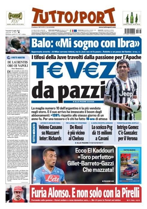TUTTOSPORT TEVEZ – La maglia di Tevez è la più venduta tra i tifosi della Juventus.