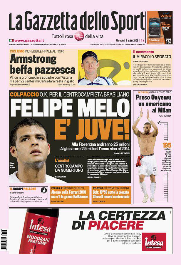 CALCIOMERCATO STORY 2009 – Ripercorriamo la storia degli ultimi cinque anni del calciomercato tramite le prime pagine de La Gazzetta dello Sport. Tra quelle più significative vi è senza dubbio quella del 7 luglio 2009, esattamente 4 anni fa, riguardante in particolare la Juventus. La Signora si assicurava Felipe Melo per circa 25 milioni di euro e la Gazzetta dello Sport titolava con “Colpaccio!”. Il Milan, invece, accoglieva l’americano Onyewu: entrambi i colpi sappiamo come sono andati a finire…