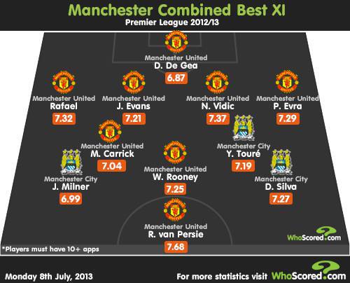 FOTO MANCHESTER UNITED MANCHESTER CITY – Idea paradossale ma ve lo immaginate se il Manchester United e il Manchester City si fondessero in un’unica squadra? Uscirebbe fuori una corazzata davvero temibile. Intanto, ci siamo divertiti, seguento Whoscored, a mettere insieme gli 11 giocatori che meglio hanno fatto delle due squadre inglesi. In porta De Gea meglio di Hart, difesa tutta Red Devils con Rafael, Vidic, Evans ed Evra. In mezzo al campo Carrick e Tourè (City) dietro a Milner, Silva, Rooney e Van Persie.