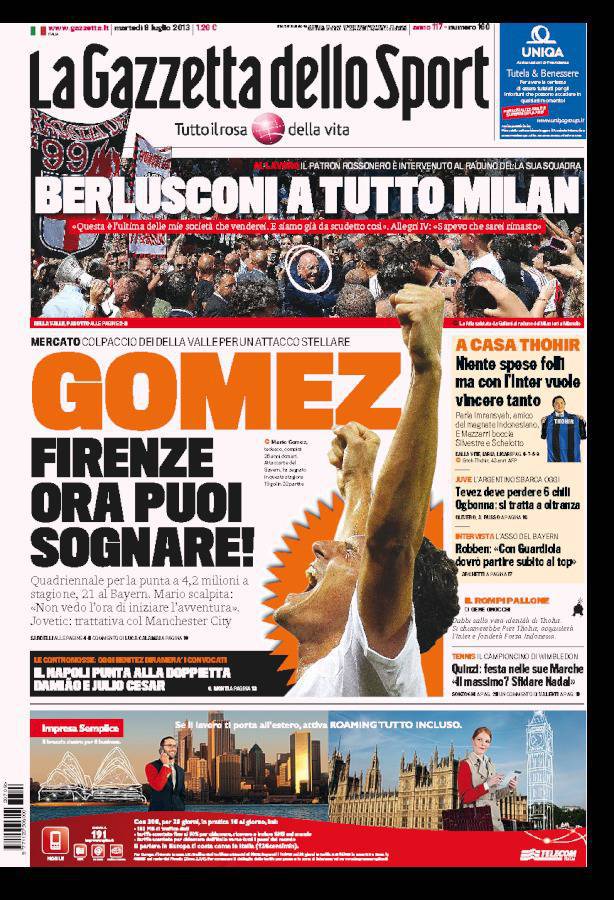 GAZZETTA GOMEZ – Sulla Gazzetta dello Sport si parla della Fiorentina che ufficializza l’acquisto di Mario Gomez.