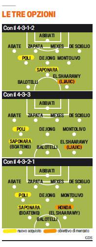 FOTO MILAN ALLEGRI 3 MODULI – Il ritiro estivo, già iniziato per il Milan, permetterà al tecnico rossonero, Massimiliano Allegri, di studiare e provare diverse situazioni tattiche. Come già delineato nella riunione con Galliani e Berlusconi, il modulo di riferimento della squadra meneghina sarà il 4-3-1-2, ma nessuno vieterà all’ex allenatore del Cagliari, di trovare in corsa una veste più congeniale. La Gazzetta dello Sport, ha quest’oggi pubblicato 3 ipotesi di formazione per la squadra rossonera: oltre al 4-3-1-2 infatti Allegri potrebbe utilizzare il 4-3-3 visto nella scorsa stagione ed anche il 4-2-3-1.