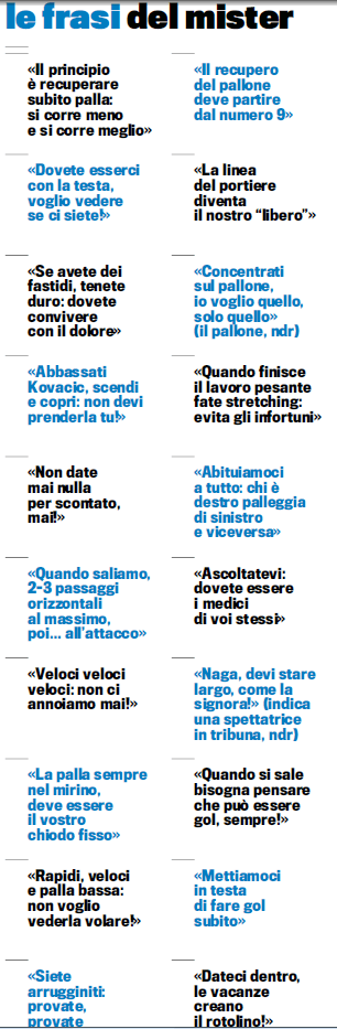FOTO INTER MAZZARRI – Sono state giornate intense quelle di Walter Mazzarri, nuovo tecnico dell’Inter, impegnato momentaneamente nel difficile ritiro di Pinzolo. Tante indicazioni tattiche ma soprattutto tanti discorsi motivazionali per i suoi, reduci da una stagione che definire disastrosa è poco. La Gazzetta dello Sport, nel numero andato in edicola stamani, ha raccolto le migliori frasi momentaneamente pronunciate dal tecnico livornese durante il ritiro di Pinzolo. Parole importanti che, siamo certi, motiveranno fortemente gli uomini della squadra nerazzurra…