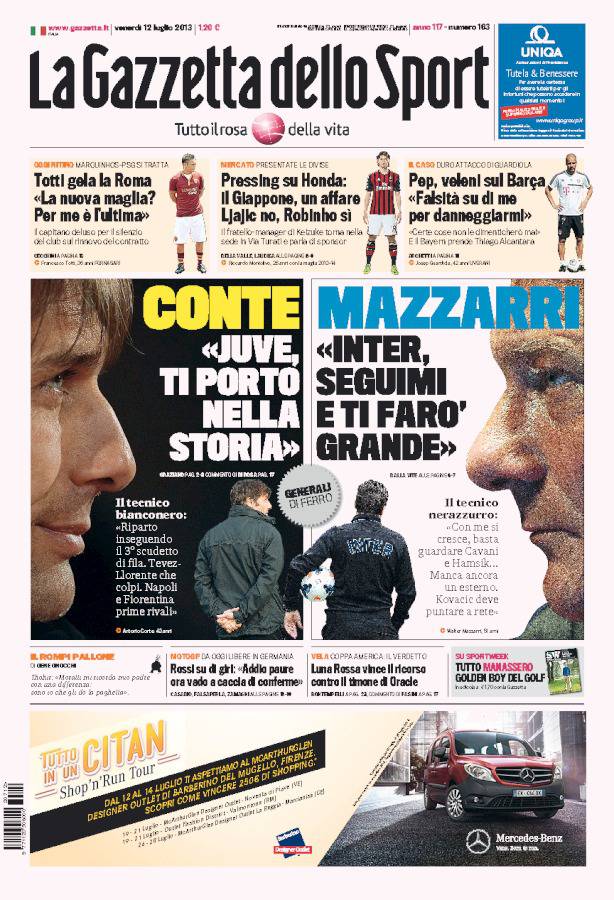 GAZZETTA CONTE – Sulla Gazzetta dello Sport si parla di Antonio Conte che vuole vincere ancora ma anche di Mazzarri e della sua nuova Inter.