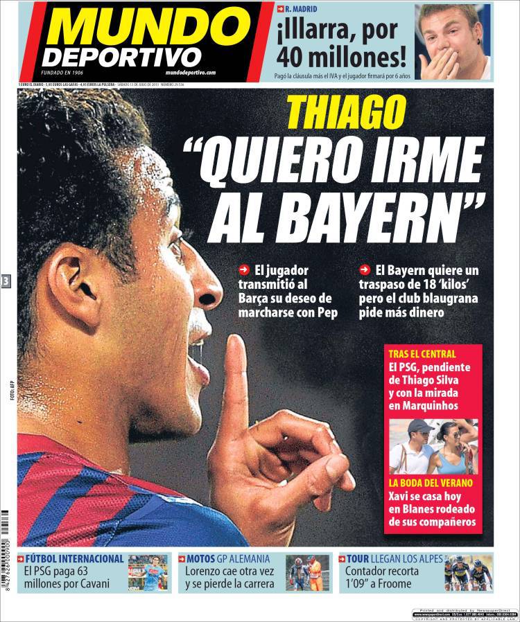 MUNDO DEPORTIVO THIAGO ALCANTARA – Thiago Alcantara esce allo scoperto e chiede di raggiungere Guardiola al Bayern Monaco.