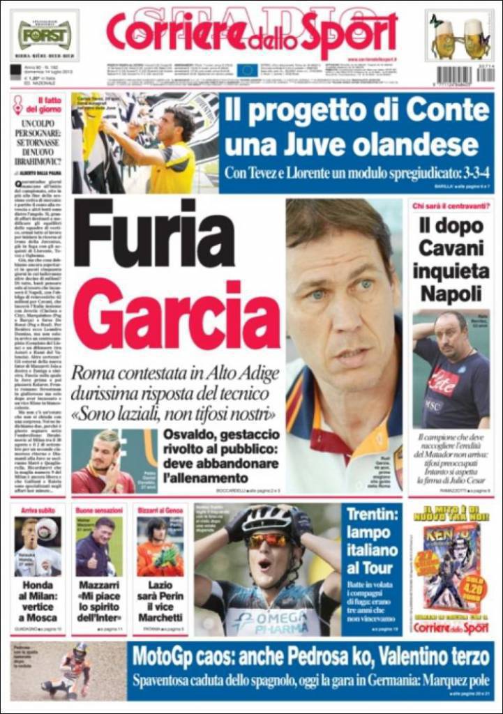 RASSEGNA STAMPA CORRIERE DELLO SPORT – Roma contestata in Alto Adige. Durissima risposta del tecnico: “Sono laziali, non tifosi nostri“. Osvaldo, gestaccio rivolto al pubblico: deve abbandonare l’allenamento. Il progetto di Conte: una Juve olandese. Con Tevez e Llorente un modulo spregiudicato: 3-3-4. Il dopo Cavani inquieta Napoli. Honda al Milan: vertice a Mosca. Mazzarri: “Mi piace lo spirito dell’Inter”.