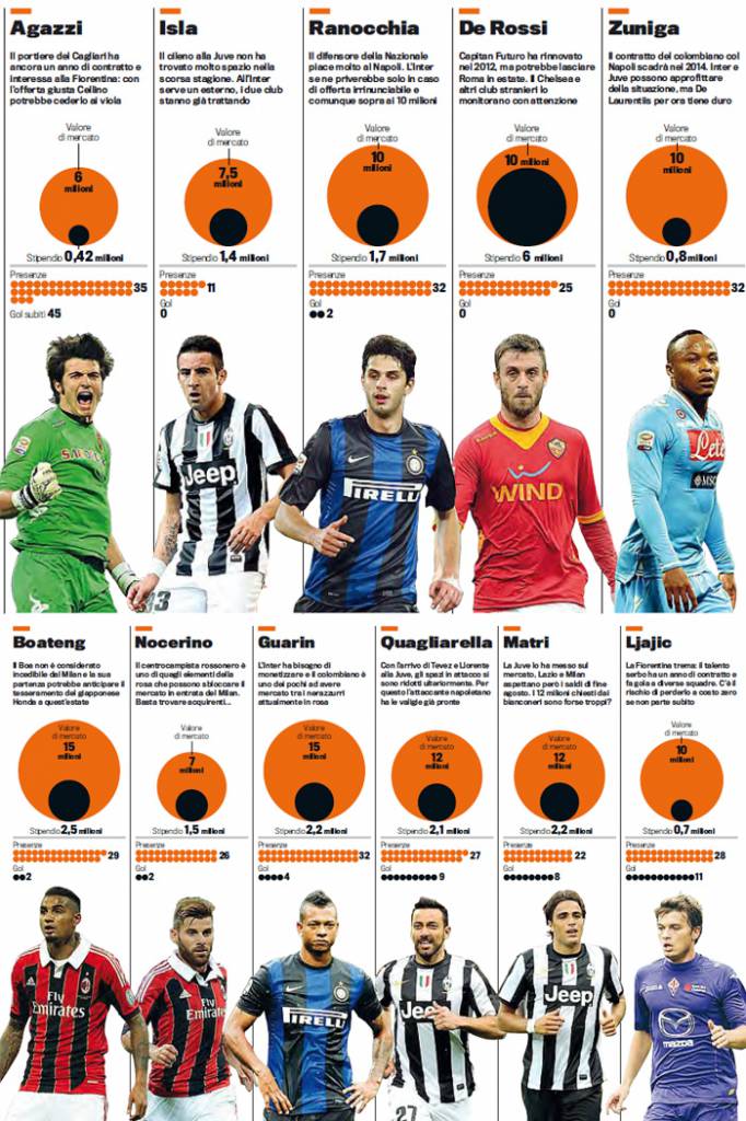 FOTO CALCIOMERCATO SERIE A VALORI RICHIESTI MERCATO – Dopo anni di stallo, nonostante il periodo poco florido per le società italiane, nello stivale le società si stanno attrezzando, avendo trovato delle nuove strade per riportare calciatori di valore del massimo campionato italiano. Tevez e Mario Gomez sono gli esempi più lampanti: non temiamo smentita quando diciamo che, fino ad un anno fa, pensare a questi due giocatori in Serie A era utopia. La Gazzetta dello Sport, concentrandosi sul mercato italiano, ha preparato una infografica che mette sullo stesso piano diversi calciatori del calciomercato della Serie A. Quanti di questi potrebbero spostarsi?