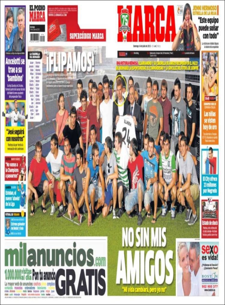 RASSEGNA STAMPA MARCA – Prima pagina del quotidiano spagnolo dedicato all’ultimo acquisto del Real Madrid, Illarramendi, pagato 39 milioni di euro. Il presidente, Florentino Perez, mostra orgoglioso la sua nuova maglia.