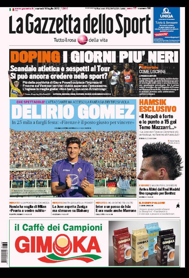 GAZZETTA GOMEZ – Sulla Gazzetta dello Sport si parla di Mario Gomez che è stato presentato davanti a 25 mila spettatori.