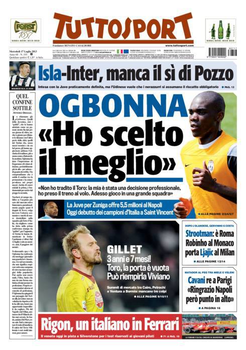 TUTTOSPORT OGBONNA – Su Tuttosport si parla di Ogbonna che ieri è stato presentato dalla Juventus.