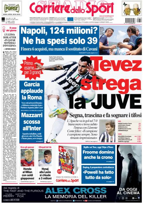 RASSEGNA STAMPA CORRIERE DELLO SPORT- Rudi Garcia applaude la Roma che sta nascendo: nove gol al Brunico. L’Inter non va: appena 3 reti al Trentino, Mazzarri dà la scossa: “Niente paura, ci serve solo un po’ di tempo”. Tevez strega la Juventus: gol e grande intesa con Llorente. Conte ammette: “Il campione è campione sempre, mi ha impressionato”. Il Napoli può spendere 85 milioni sul mercato.
