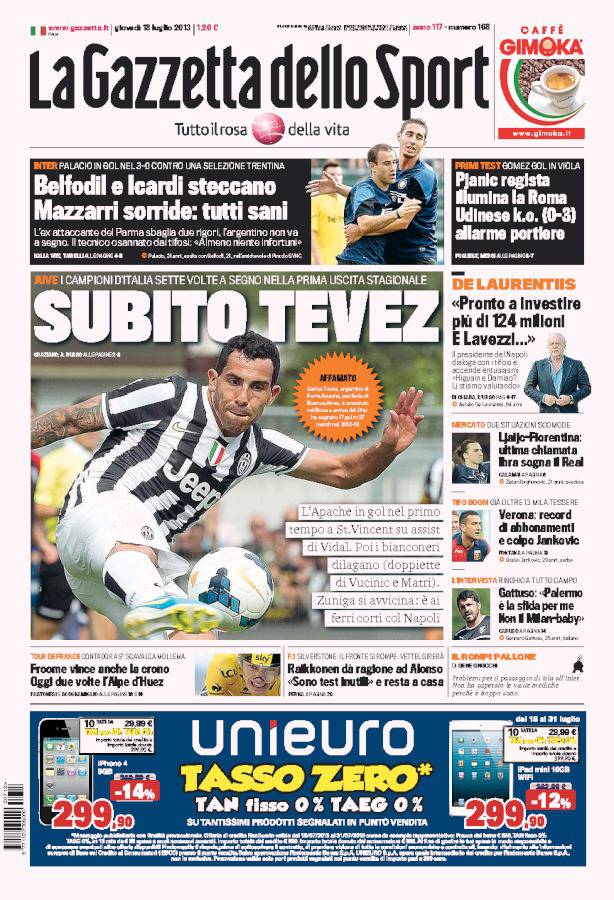 GAZZETTA DELLO SPORT RASSEGNA STAMPA- Ljajic deve decidere: rinnova con la Fiorentina o se ne va? Ibrahimovic sogna il Real Madrid. Tevez trascina subito la Juventus, Belfodil e Icardi steccano ma Mazzarri è tranquillo: “Tutti sani”. Gattuso contento per la sfida-Palermo: “E’ il posto giusto per me”. De Laurentiis promette: 124 milioni sul mercato.