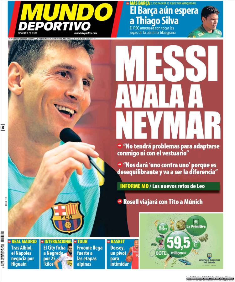 RASSEGNA STAMPA MUNDO DEPORTIVO- Messi approva Neymar al Barcellona: “Non avrà problemi ad adattarsi nè a trovare l’intesa con me o con la squadra”. Il Manchester City ufficializza Negredo.