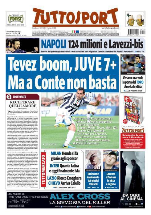RASSEGNA STAMPA TUTTOSPORT- Antonio Conte non si accontenta: la sua Juventus parte subito forte (7 gol alla Rappresentativa Val Da Osta), ma il tecnico bianconero non è ancora soddisfatto: “Bisogna chiudere alcuni discorsi di mercato”. Intanto presidente del Napoli, Aurelio De Laurentiis gioca a carte scoperte: può investire 124 milioni sul mercato e rivela alcune trattative: “Non trattiamo solo Damiao e Higuain. Il ritorno di Lavezzi? Perchè no…”