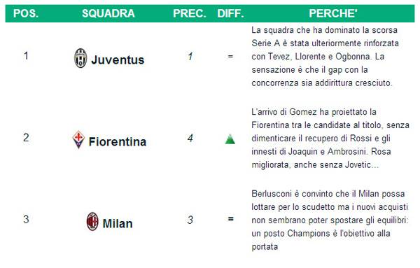 CLASSIFICA VIRTUALE 2013-2014 – Come sarebbe la classifica di Serie A 2013-2014 se il mercato finisse oggi? A questo dilemma ha provato a dare una risposta la redazione dei colleghi di Goal.com. Il noto portale, tramite il piazzamento della scorsa stagione, il mercato effettuato e il valore della rosa, ha elaborato la classifica virtuale della Serie A. Il primo posto è occupato ancora dalla Juve mentre sorprende la Fiorentina al secondo piazzamento. Milan che si conferma sul gradino più basso del podio mentre scivola il Napoli, che dal secondo piazzamento si porta in sesta posizione, dopo la Lazio (quarta) e l’Inter (che risale dal nono al quinto posto). La Roma, infine, scende di una posizione dal sesto al settimo. Siete d’accordo con questa classifica?