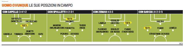 FOTO ROMA TOTTI CAMPIONE DUTTILITA’ 4 POSIZIONI ALLENATORI – Sarà forse l’ultima annata da calciatore per Francesco Totti, capitano e numero 10 della Roma che, anche quest’anno, si sta impegnando al massimo per dimostrare al nuovo tecnico Rudi Garcia di poter contare su di lui. Il talento, e sembra anche scontato dirlo, al capitano non manca, ma a sorprendere di più, giunto alla vetta dei 36 anni, sono l’abnegazione e soprattutto il sacrificio di voler svolgere dei compiti che, solitamente, per chi arriva a questa fase della carriera sono impensabili. Una grafica della Gazzetta dello Sport, nota l’evoluzione del ruolo di Totti, che con gli ultimi 5 allenatori della Roma ha addirittura cambiato 4 posizioni diverse. Che aggiungere? La carriera di Totti, si commenta da sola…