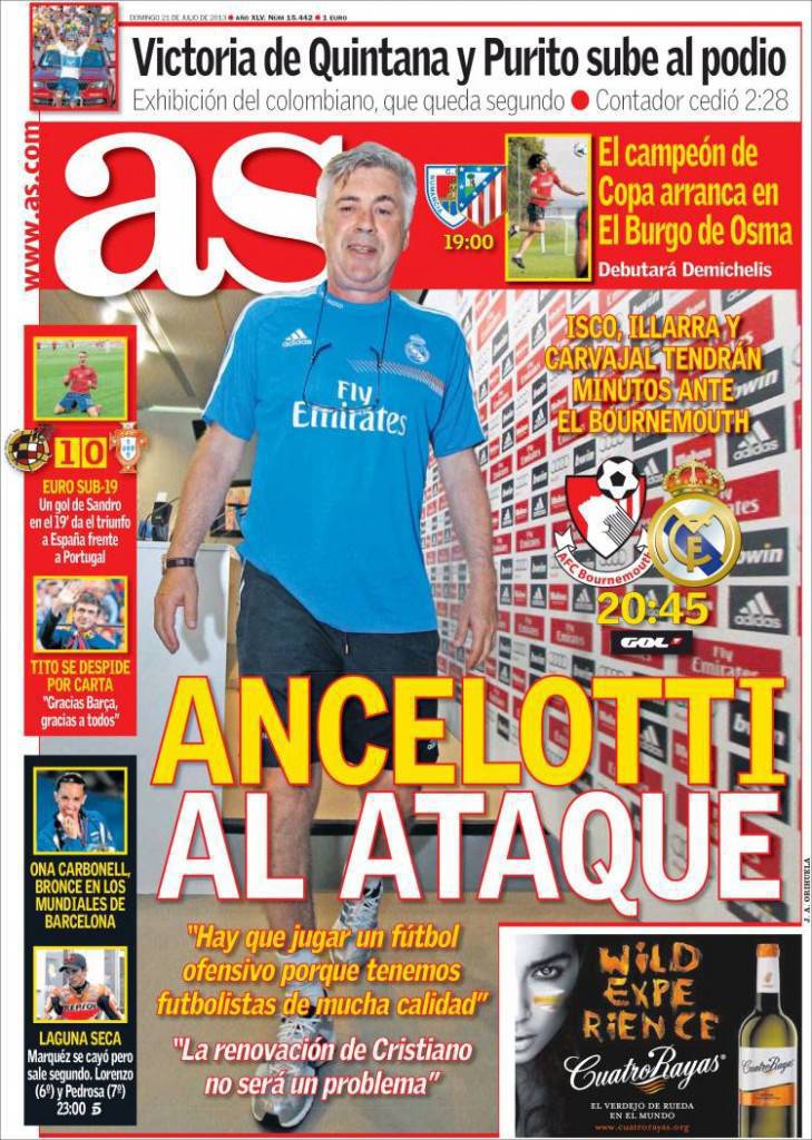 RASSEGNA STAMPA AS – Il Real Madrid di Carlo Ancelotti è pronto a debuttare. Il tecnico va all’attacco: “Dobbiamo giocare un calcio offensivo, perché abbiamo giocatori di alta qualità. Il rinnovo di Cristiano Ronaldo non sarà un problema”.